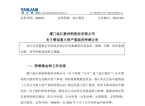 Recently, Xiamen Yanjan New Material Co., Ltd. issued an announcement stating that it intends to acquire control of Ningbo Yongqiang Technology Co., Ltd. by way of issuing shares and paying cash, and will raise supporting funds. This transaction is expected to constitute a major asset restructuring, and the company's shares have been suspended from trading since the market opened on January 5, 2026. Xiamen Yanjan New Material Co., Ltd. expects to disclose the transaction plan for this acquisition by January 19, 2026.