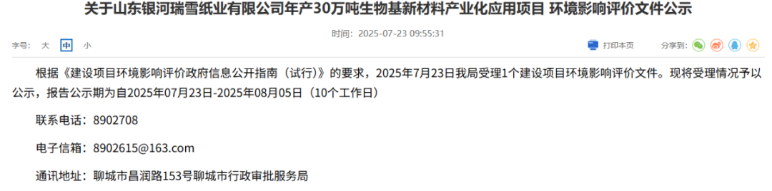 On July 23, the environmental impact assessment of Shandong Yinhe Ruixue's 300,000 tpy industrialization application project for bio-based new materials was publicized. According to the publicity document, Yinhe Ruixue intends to eliminate the existing wheat straw chemical pulp production capacity and build a new 300,000-ton bleached chemical pulp project in order to optimize the product structure, considering the future market prospects, national strategic requirements and the realization of the "dual carbon" goal. The project includes: an annual output of 80,000 tons of hardwood pulp, 70,000 tons of softwood pulp and 150,000 tons of fluff pulp. Among them, hardwood pulp and softwood pulp are used in the production of existing papermaking projects, and fluff pulp is made into dry pulp boards for external sale. The total investment of the project is about 2.2 billion yuan, and it is planned to start construction in January 2026 and put into operation in December 2027.