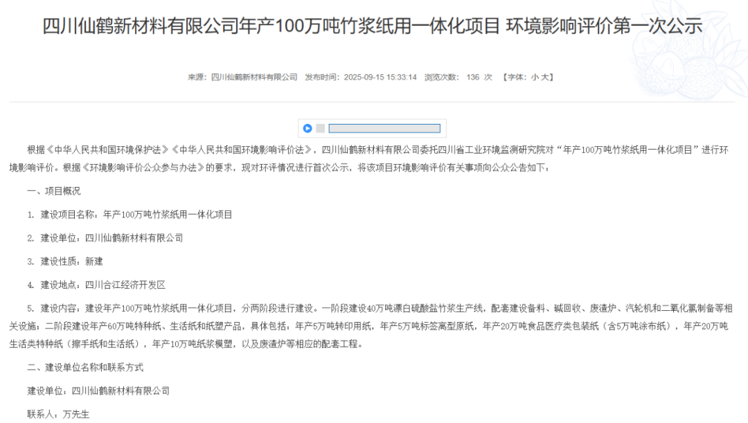 Recently, Sichuan Xianhe New Materials Co., Ltd. of China has released the Environmental Impact Assessment (EIA) for its 1-million-tpy integrated bamboo pulp and paper project. Among the project's Phase II construction plan, it includes a capacity of 200,000 tpy for tissue paper (hand towels and other types of tissue paper), and the project is located in Sichuan Hejiang Economic Development Zone.