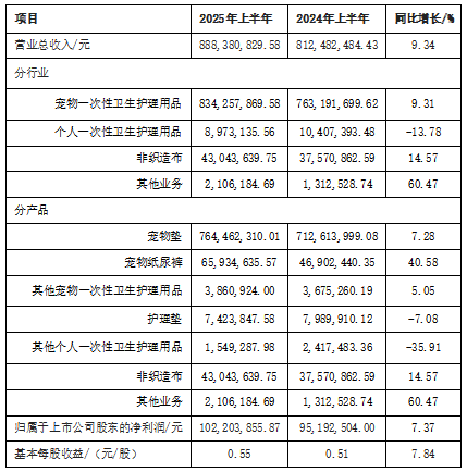 Tianjin Yiyi Hygiene Products Co., Ltd. achieved total operating revenue of approximately RMB 888 million in the first half of 2025, representing a year-on-year increase of 9.34%. Its net profit attributable to shareholders of the listed company reached around RMB 102 million, with a year-on-year growth of 7.37%. The basic earnings per share (EPS) stood at RMB 0.55 per share, up 7.84% year-on-year.
