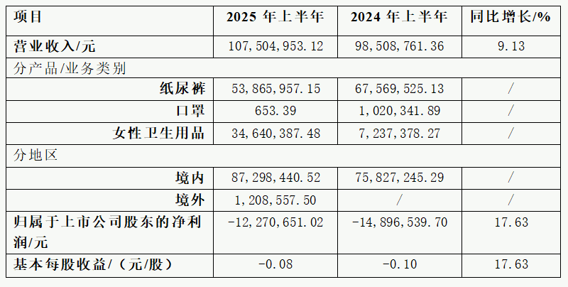 Daddybaby Company Limited achieved an operating revenue of approximately 108 million RMB in the first half of 2025, representing a year-on-year increase of 9.13%. The net profit attributable to shareholders of the listed company was about -12.27 million RMB, representing a year-on-year increase of 17.63%. The basic earnings per share stood at -0.08 RMB per share, representing a year-on-year increase of 17.63%.