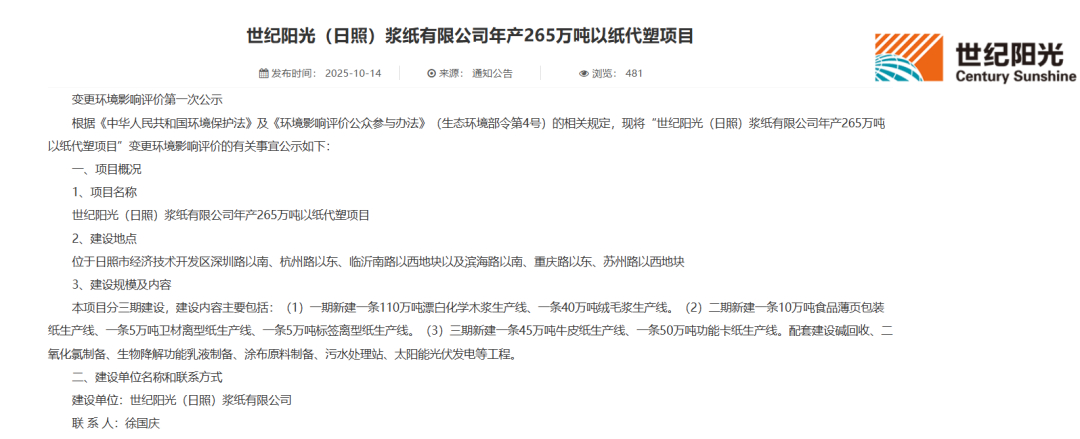 Recently, Shandong Century Sunshine Paper Group released the updated environmental impact assessment (EIA) public notice for its 2.65 million tpy "Paper Replacing Plastic" project. The most significant change of the project is that a 400,000 tpy chemi-mechanical pulp line will be replaced with a 400,000 tpy fluff pulp line, which will be constructed in the first phase ahead of schedule.