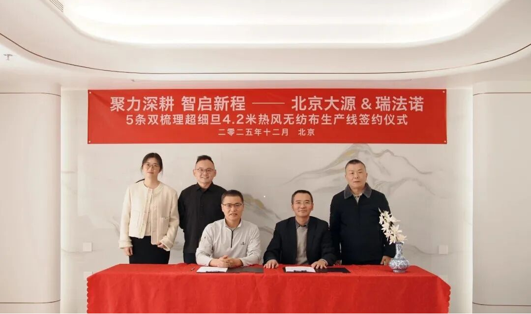 On December 9, Beijing Dayuan Nonwoven Fabric Co., Ltd. signed an agreement with Refano (Suzhou) Machinery Technology Co., Ltd. in Beijing. The deal covers 5 sets of 4.2m dual-carding microfiber through-air nonwoven production lines, which will form a customized through-air nonwoven production project with a capacity of 20,000 tpy.