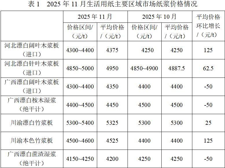 According to Tissue Paper & Disposable Products magazine, the average price of pulp in Hebei and Sichuan-Chongqing rose. Among these, the prices of bleached hardwood pulp board (imported) in Hebei and unbleached bamboo pulp board in Sichuan-Chongqing saw the sharpest increase, rising by RMB 125 per ton. The average price of pulp in Guangxi decreased by RMB 50 per ton. The average price of bleached pulp parent tissue roll in Hebei and bleached bamboo pulp parent tissue roll in Sichuan-Chongqing rose by RMB 75 per ton. The average price of bleached pulp parent tissue roll and bleached bagasse pulp parent tissue roll in Guangxi decreased by RMB 50 per ton. The unbleached bamboo pulp parent tissue roll remained stable, which was consist with that in October.